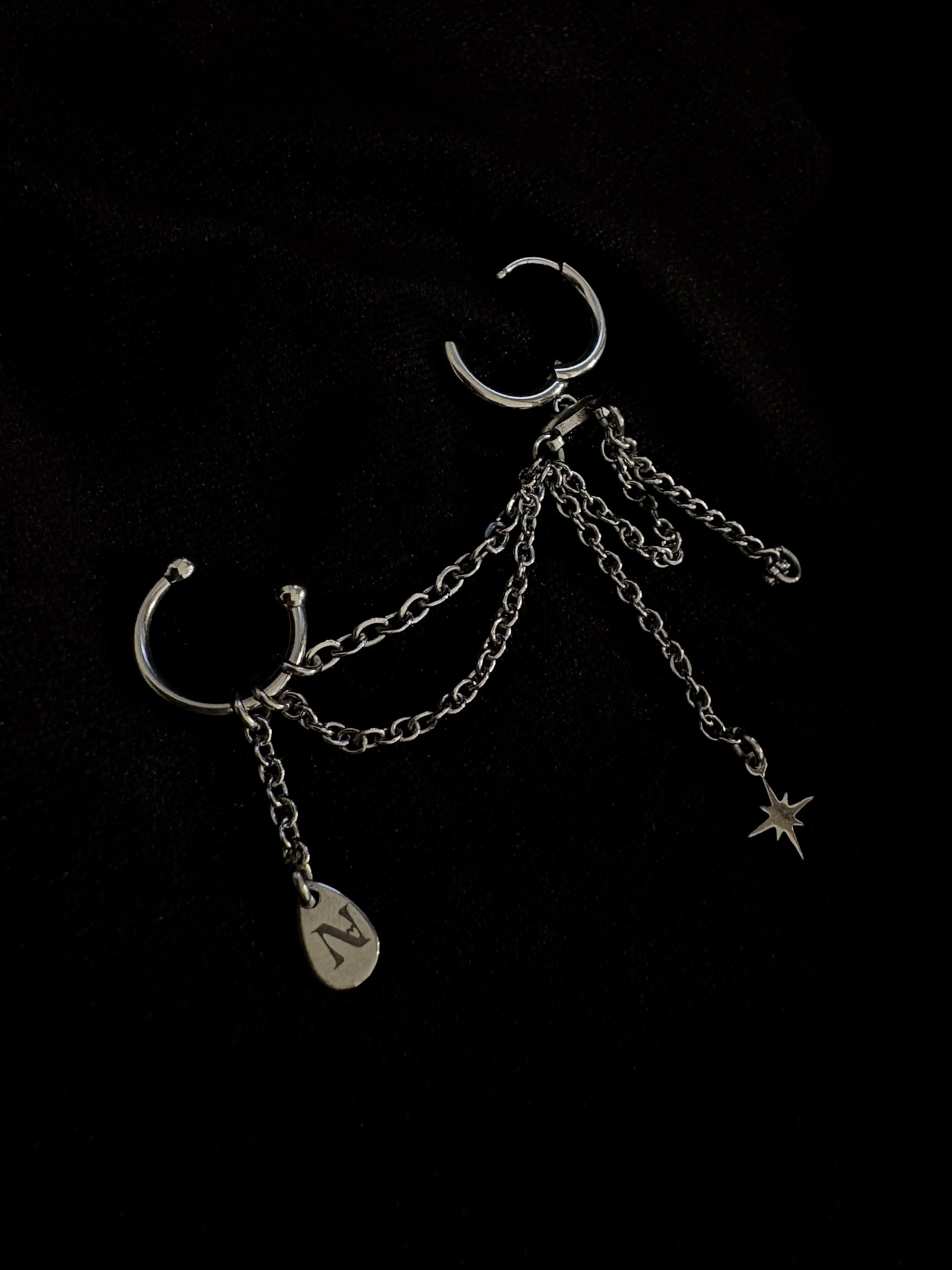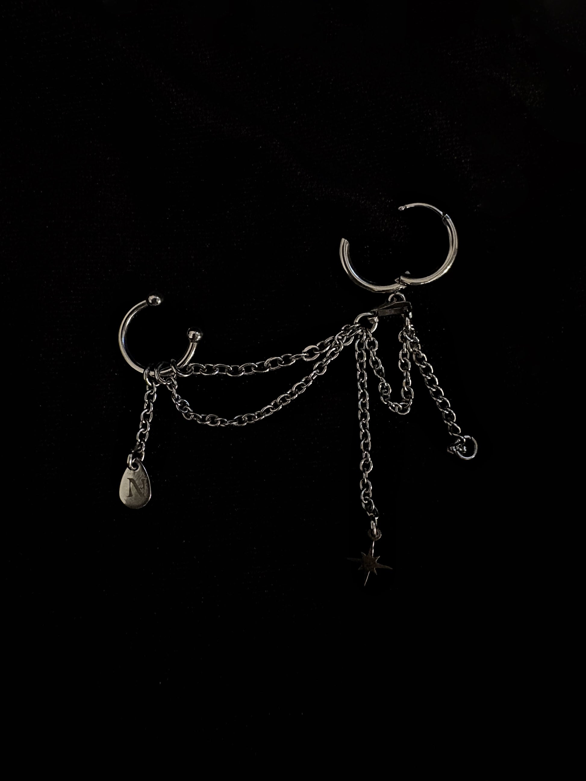 Thémis se porte seule, mais n’est jamais incomplète. Elle nécessite seulement un piercing au lobe ! Elle relie celui-ci au creux de l’oreille dans une danse de chaînes fines, mobiles et aériennes, qui tombent puis se rejoignent en un point d’harmonie.